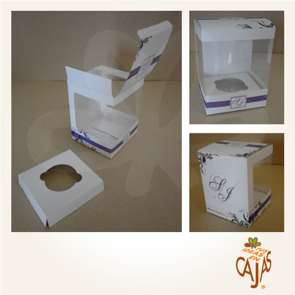 Caja de cartón Bristol blanco, compuesta por caja con 3 ventanas en acetato y base para el Cupcake. Muy fácil de montar, ideal para regalos, eventos o tiendas. Imprimible en las 4 caras y tapa